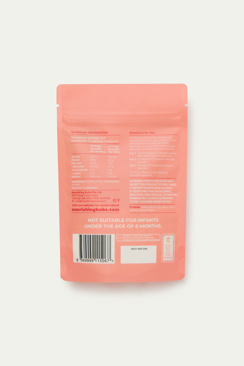 Our Prawn Powder has been thoughtfully created to make both introduction and ongoing maintenance simple. Just mix the recommended amount into a previously tolerated puree or meal and offer to your bub.