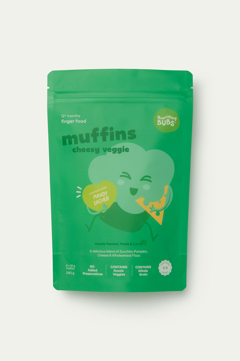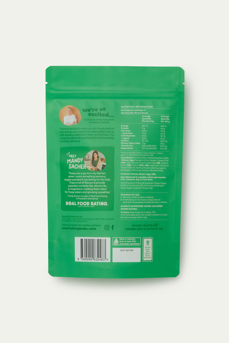 Each pack contains: 8 x 30g Cheesy Veggie Muffins (240g total)