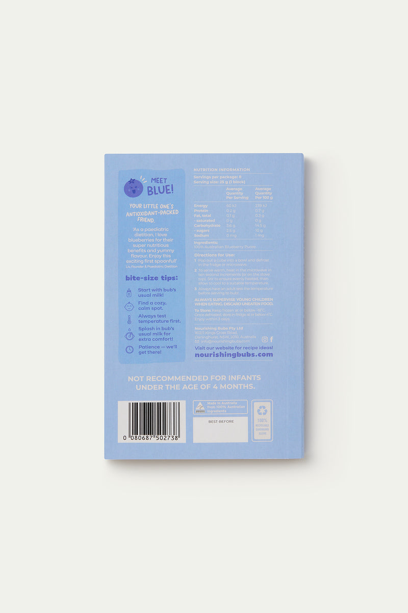 Each pack contains 8 x 25g cubes of smooth, gently cooked blueberry puree, perfect for babies from the moment they start solids. Serve on its own or get creative—combine with other fruits, mix with oats and yoghurt for a flavour-packed breakfast or stir through your favourite muffin recipe. The options are endless!